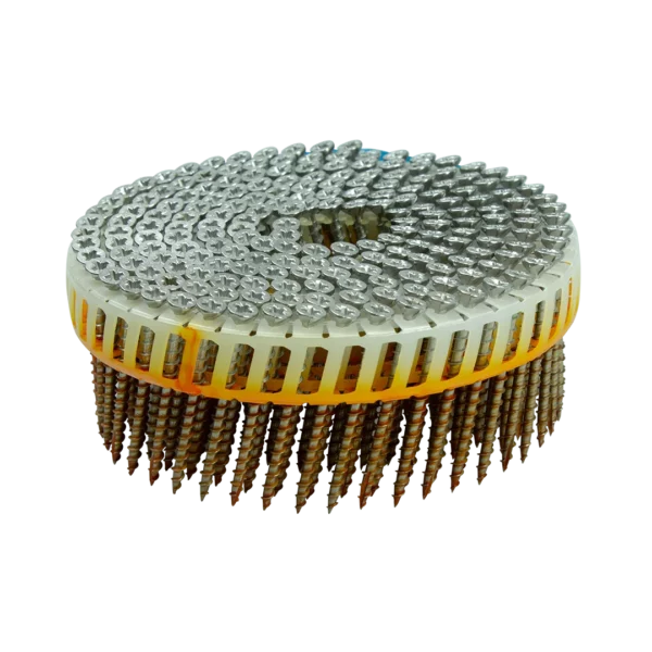 Deze Tackscrew op rol 15-16° is speciaal ontwikkeld voor zware en duurzame houtverbindingen buitenshuis. Dankzij het gebruik van gehard RVS zijn deze schroeven volledig roestvrij en bestand tegen de zwaarste weersomstandigheden. De schroeven zijn plastic verbonden op rol (200 stuks per rol) en kunnen snel worden verwerkt met een coilnailer zoals de RFEW-CSN790.
